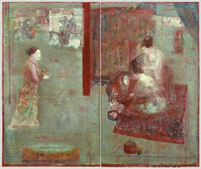 此后,冷宏辗转来到加拿大,进入他艺术生涯的另一个阶段,每年有七八个月将自己关在画室里创作。在与大自然美景心灵沟通的每个闪亮瞬间,他的艺术激情不可遏止地喷涌着,鲜亮的油彩一遍遍倾泻在大幅油画布上,一个个浓缩并透露着唐宋气象、明清情韵的宫中仕女,或手执团扇,或对镜梳妆,或蕉下吹箫,或兰舟御风,满眼烟云中无不散发出这个羁旅海外的游子对祖国文化的景仰与爱戴。在这些无比优雅的仕女身后,浓暗的背景像是尘封的历史镜像、幽暗的官闱秘闻,但冷宏总会从心底取来一束暖暖的光,照亮她们的面庞,同时也照亮海外华人的浓浓乡愁,绵绵情思。正是这种乡愁与情思,使西方人看到了东方哲学的深奥含义和具有普遍价值的人性清辉。