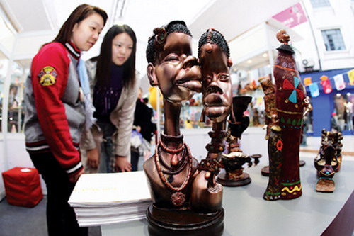 雁荡路“创意大道”上,造型独具创意的非洲人塑像上午吸引了不少参观者驻足 本报记者 周铭鲁摄