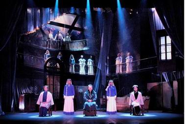 怎样打破《雷雨》演出中渐趋僵化的模式,给观众带来心灵的冲击和观赏的魅力,是王延松反复思考的问题。在其导演的《雷雨》第三幕中,周家和鲁家的场景并现于舞台中,过去、现在、想象的时空交织,多角度、多视点的呈现着富有魔力的戏剧情景。在鲁家,回到自己家中的四凤,刚在母亲面前发誓不见周家的人,父亲便向她讲述了周家“闹鬼”的真相,此时舞台后方的半天空里,幽幽地显出了周萍和繁漪相拥的背影,他们“闹鬼”的窗子,仿佛是旷野中的鬼火,在四凤的视觉中透出恐惧和惊悚的光影。紧接着这扇窗子像鬼魂一样,游荡在舞台的天幕上,猛的一下子掉落在四凤的面前,那仿佛是她心灵深处生命绝望的断裂声。一道炸雷过后,周萍出现在窗前,在他迈过窗棂的一刹那,闪电中出现了繁漪阴毒的面容。而在这些戏剧动作发生时,舞台的一角,孤独的周朴园始终默然的呆坐着。很多看过戏的人惊叹这扇窗子是导演的神来之笔,因为它点化了这场戏的魔力。此时的“窗子”不再是一个实有的物象,而是一个恐怖的影像,一个具有象征意味、纠缠着复杂心理意绪和丰富想象的戏剧意象。这出戏一开始就表达着“闷”的氛围,孕育着人物命运的“雷雨”,因此“窗”要不要打开,打开了要不要关上,就不仅仅是一个戏剧动作的交代,而带有了人物情绪的外化色彩。第三幕中凸现的窗子,与整部戏剧的氛围与寓意形成一种内在的默契,强化了戏中人不自知的鬼魅般人生的象征寓意。戏剧结尾时,唱诗班的歌声响起,剧中人的死亡,不是作为情节再现在舞台上,而是作为侍萍和繁漪心灵深处永久的剧痛,不时地幻化出死亡的尖叫和痛苦的轰鸣。当舞台上方的穹顶现出亮光时,三个死去的年轻人出现在空中最顶端,而这时唱诗班的身影在中间承上启下,他们的脚下是现实中三位老人的悲剧人生。也许有人要说导演所表现的宗教意味过浓,但是只要人类对自己的终极价值保持追问的兴趣和哲学的省思,其心理感觉中的诗意就必然地带有某种超脱的憧憬和升华的可能。
