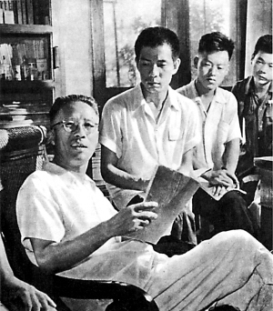 朱端钧生前常在寓所接待学生的来访、求教。左起为朱端钧、魏宗万、刘子枫、许教靖。 资料照片