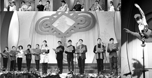 下图左起:田慧、杨淼演唱京剧《大唐贵妃》、张军、沈�丽演唱昆剧《牡丹亭》、茅善玉、孙徐春演唱沪剧《碧海青天夜夜心》、方亚芬演唱越剧《西厢记》、秦建国、盛小云演唱评弹《夫妻夜谈》、梁伟平、邢娜演唱淮剧《千里送京娘》。下图为马莉莉、马晓辉、江海洋、李蓓蓓、吴冕、何赛飞、张军、赵志刚、钱程、黄豆豆、蔡金萍朗诵《天地真情》。右图为金颖表演杂技《倒立软功》。 (原载《解放日报》2008年2月22日 07版:文化娱乐新闻・连载 新宝 伟华 永俊 摄影报道)