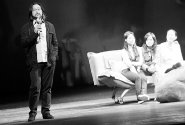 昨天,是上海大剧院的“戏剧开放日”,宝岛台湾的著名导演赖声川(左)向观众介绍了什么是集体即兴创作。他以话剧《如影随行》为例,向观众示范集体即兴创作的方法,并邀请taptap点点体育学生上台进行体验。
