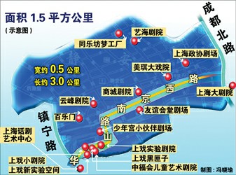 (上海戏剧谷:以上海商城剧院、美琪大戏院、百乐门等优质剧院资源为依托,以音乐剧、都市话剧、时尚戏曲等现代戏剧为重点产品形态,在东起成都北路、西至镇宁路,以南京西路至华山路一线为中轴,宽约0.5公里、长约3公里的区域,打造现代戏剧产业的核心谷地,并逐步构建文化产业辐射和商业消费联动关系。)