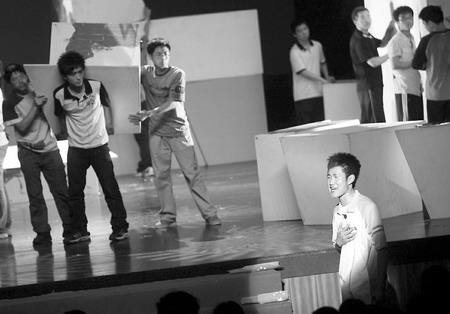 大幕徐徐拉起,黑暗中依稀看见倒在教室一角的黑板上写着“距高考还有25天”,凌乱的教室里、墙体的废墟下,不时传来同学们寻找同伴的呼喊,就在大家近乎绝望时,音乐响起,舞台变亮,一颗由延考生扮演的小草在舞台中央慢慢长高、长大――这是《延考生》的第一幕“小草”。舞台下,观者不禁潸然泪下;舞台上,表演者的眼中也噙着泪光。
