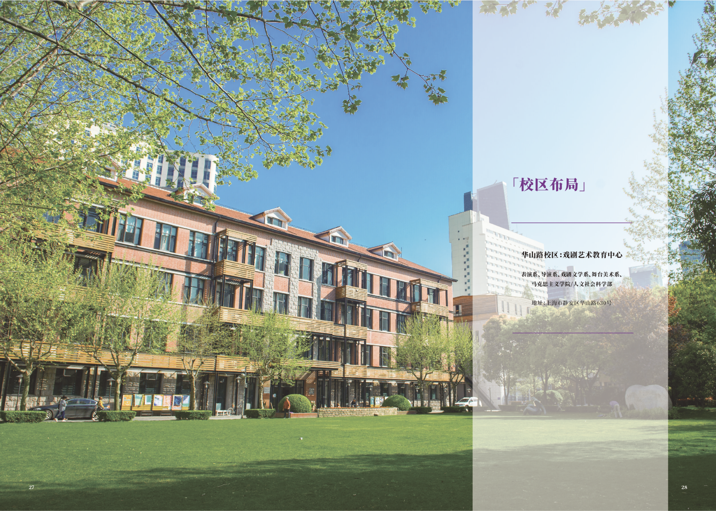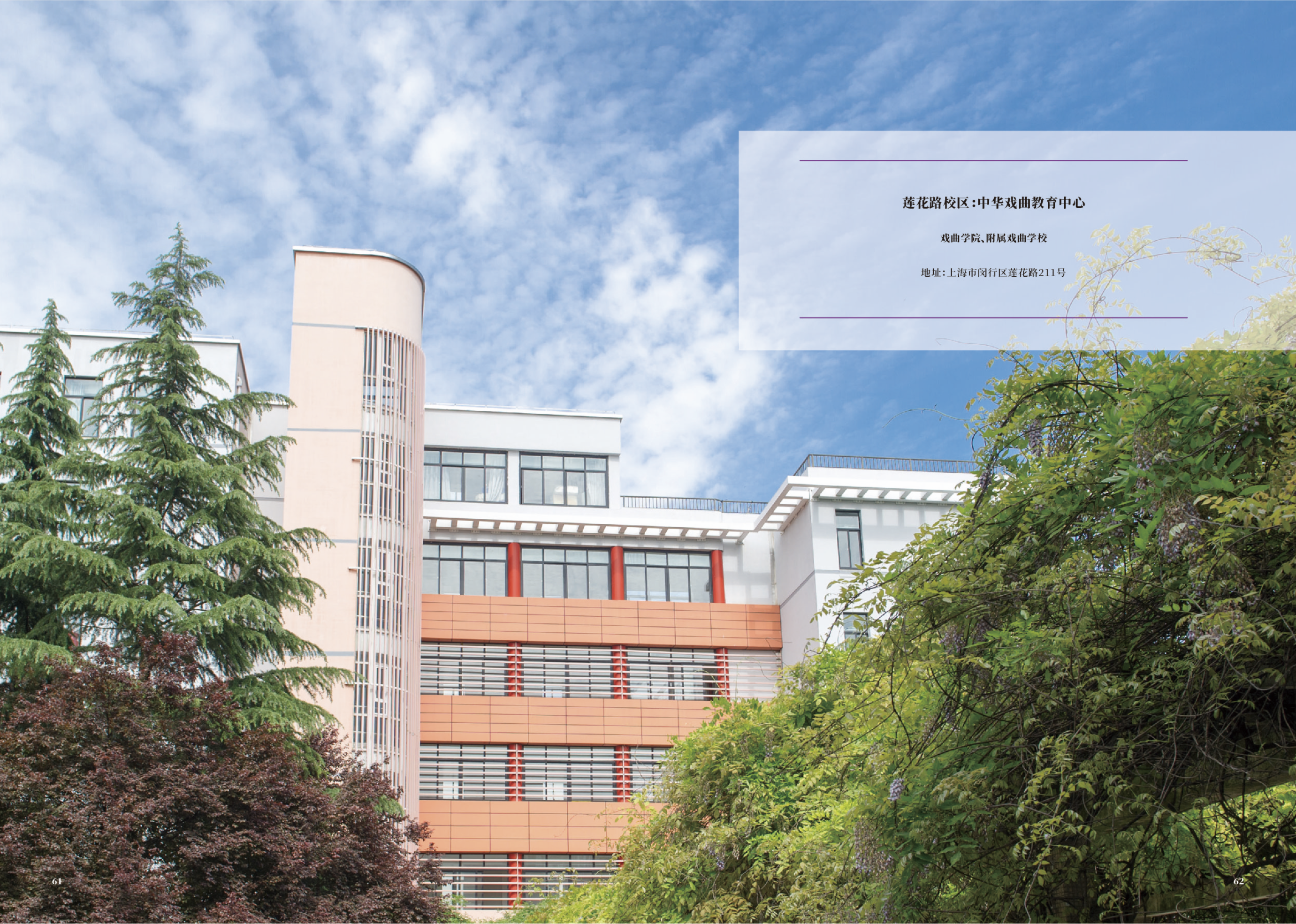 目前,学校已形成“四个中心”校区布局和功能定位,分别为——戏剧艺术教育中心:华山路校区;中华戏曲教育中心:莲花路校区;国际舞蹈教育中心:虹桥路校区;影视新媒体教育中心:昌林路校区。