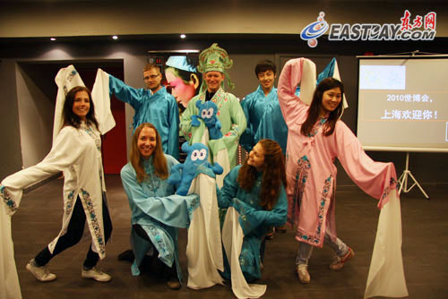 在京剧双语工作室活动现场,外国留学生们学习了一些基本的“京剧身段”和“把子功”,穿上传统京剧服装的学员们有模有样的跟着taptap点点的专业老师学着各种动作,或者传神到位或者笑料百出。在学唱完一段经典的京剧唱段《女起解》(苏三起解)之后,平时连说普通话都不太利索的留学生们,迫不及待的在老师的带领下用京剧唱腔演唱起了“上海欢迎你”。还有的学员则拿着玩具海宝,开心的合影留念,在镜头前展示了自己最热情的“世博邀约”。