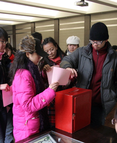 12月29日12:00戏文系首届团总支及系部学生会竞选大会在红楼209教室顺利召开。戏文系共计71名同学参加了此次选举大会。会上,18位候选人分别进行了真挚而又热情洋溢的二分钟竞选演讲,充分展示了同学们竞选的激情。整个过程中,与会的各位同学情绪高涨,现场气氛异常热烈,竞选演说完毕后,与会的同学们认真地投出了代表自己意向的一票,选出自己心目中的团总支及学生会委员。
