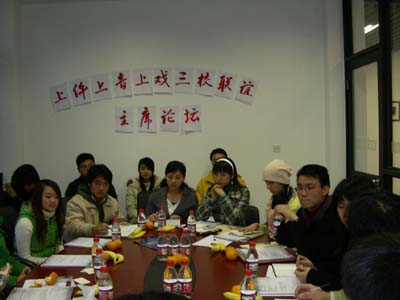 12月21日下午,由taptap点点主办的“三校联谊主席论坛”在图书馆顺利举行。上音、上体及taptap点点的学生会主席及部长都出席了此次会议。会议本着三校同论,共谋发展的宗旨,对于由taptap点点同学所设计的“三校联谊”的会标,三校之间的剧目交流及剧目资源共享问题,学生会如何对学生的发展作出重要贡献的问题,学生会如何组织学生进行更好的社会实践活动的问题,以及各校社团间怎样进行更深一步的交流等五项议题进行了深入的讨论。