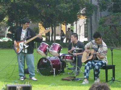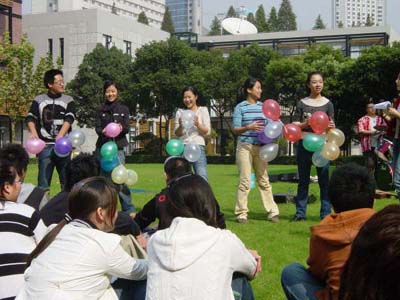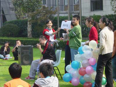11月6日中午,一场名为“课”“娱”“休”“戏”的文娱活动在红楼前草坪举行。秋阳照射下的草坪在彩色气球的装点下显得更加明丽可爱,焕发着动人的活力。活动由乐队音乐串烧和互动游戏两部分组成。四名来自05级导演系的男生为大家带来了《明天会更好》《光辉岁月》等轻松的乐曲,拉开了本次活动的序幕。在互动游戏部分,在场同学们参加了抢凳子、有奖竞答等简单而有趣的游戏。草坪上笑声不断。大家共同度过了一段愉快的午间时光。同学们纷纷表示,非常喜爱这种课间休息方式,它除了能够让大家走出门来,到户外去享受阳光和新鲜空气,各个不同专业,不同年级的同学之间也得到了很好的交流与沟通。(记者团 王莹)