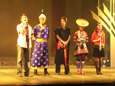 06表演系影视班达斡尔族小伙子索牧一首悠扬浑厚的蒙语独唱《蒙古人》还在余音绕梁,同班的徐凡就以一支活泼灵动、优美无比的傣家《帕织秧》舞蹈而博得满堂喝彩,04级表演系藏班阿旺仁青等5位豪迈的藏族小伙深情大气的民歌《心爱的姑娘》更是把现场气氛推向高潮。表演结束后,同为少数民族同胞的主持人百克力还别出心裁地请回几位用自己的民族语言向祖国母亲的寿辰问候,不仅让人再次感叹,taptap点点真是个民族团结的大家园。