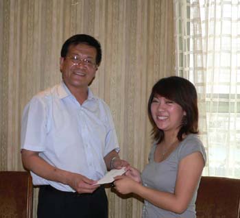 2006年7月17日中午,我院为今年参与西部服务计划的志愿者―02服化专业的戴雯静同学举行了出征前的饯行仪式。院党委副书记、副院长葛朗老师,舞美系主任刘永华老师,党办副主任黄桂英老师,团委书记徐咏老师和戴雯静的班主任潘建华老师等共同出席。此次,戴雯静同学将作为全国服务西部计划志愿者赴云南省保山市腾冲县和川乡宣传文化站开展为期一年的农村文化建设工作,葛朗老师对戴雯静同学的高尚行为给予了高度评价,也对其提出了殷切的希望。