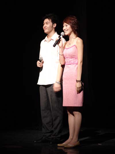 晚会由电视艺术系02级的金牌主持、“挑战主持人”节目9周卫冕的王冠和同班的高傲共同主持。一开场,小剧场内便闪现了“魅影”的神秘身姿,原来是表演系03级音乐剧班带来的音乐剧片断联唱。《歌剧魅影》、《猫》和《阿根廷别为我哭泣》等一首首脍炙人口的歌曲被他们声情并茂地演绎出来。03音乐剧班是taptap点点首批培养的音乐剧专业方向的人才,其汇报表演在我院校园里向来独树一帜,充满浓重的异域风情,在上周四周五他们的片段汇报才刚获得成功,又加紧排练,为今天的晚会奉上了新一出全方位的视听享受。