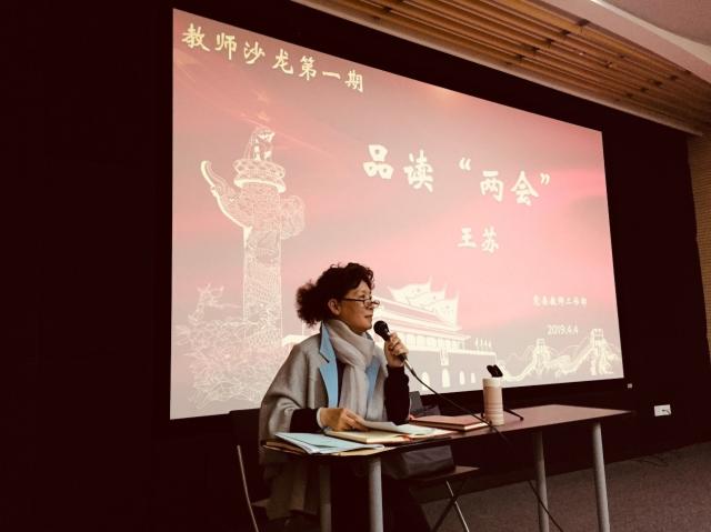 活动中,王苏老师回顾了自己赴京参加全国两会的过程,特别分享了她聆听习近平总书记看望参加全国政协十三届二次会议的文化艺术界、社会科学界委员讲话后的体会和心声。王苏老师表示:“总书记非常关心文艺创作,要求文艺工作者走进人民、以人民为中心,用心用情去讴歌人民,以精品奉献人民。文学艺术创造、哲学社会科学研究首先要搞清楚为谁创作、为谁立言的问题,这是一个根本问题。人民是创作的源头活水,只有扎根人民,创作才能获得取之不尽、用之不竭的源泉。”王老师还谈到自己去年在意大利访学交流的经历,鼓励更多taptap点点教师,特别是管理岗位的干部能够走出国门,感受文化与艺术的兼容并蓄,开拓眼界,增长见识。王苏老师还呼吁在场的各位taptap点点教职工用心、用情做好教学和教学服务工作。