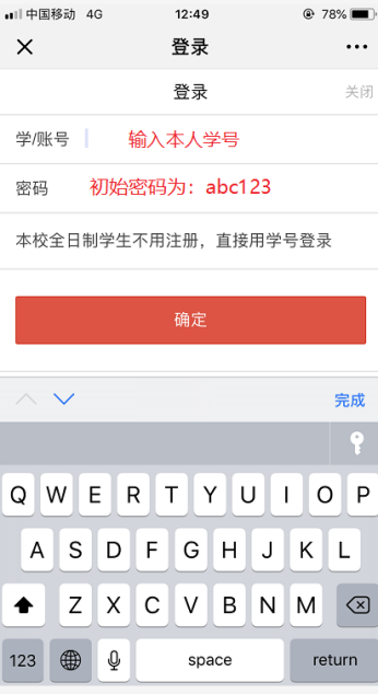 2、首次登录的同学请在“学/账号”一栏输入本人学号,“密码”一栏输入初始密码:abc123。点击“确定”,绑定手机(密码遗忘或无法登陆的,请联系学工部方老师62483329)