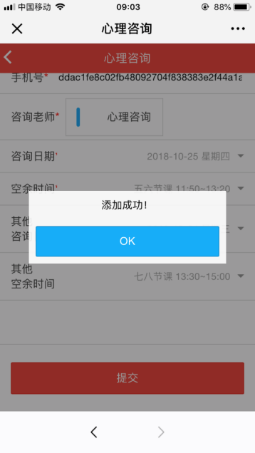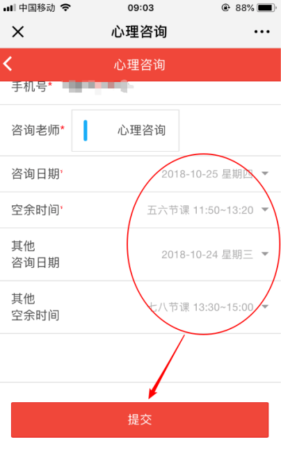 8、根据自身空余时间安排,在系统给定的最近两周内(不含双休日),选择两个时间段给心理咨询老师作参考。确认无误后,点击“提交”。