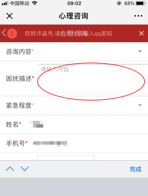 4、进入“心理咨询”主页面,请填写所有带“*”的内容,为提高咨询效率,请务必保证所填信息真实有效。