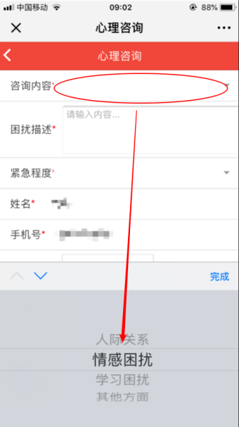 5、“咨询内容”一栏,请填写本次咨询所涉及的主要困扰类型。暂未列出或无法区分的,请选择“其他方面”。
