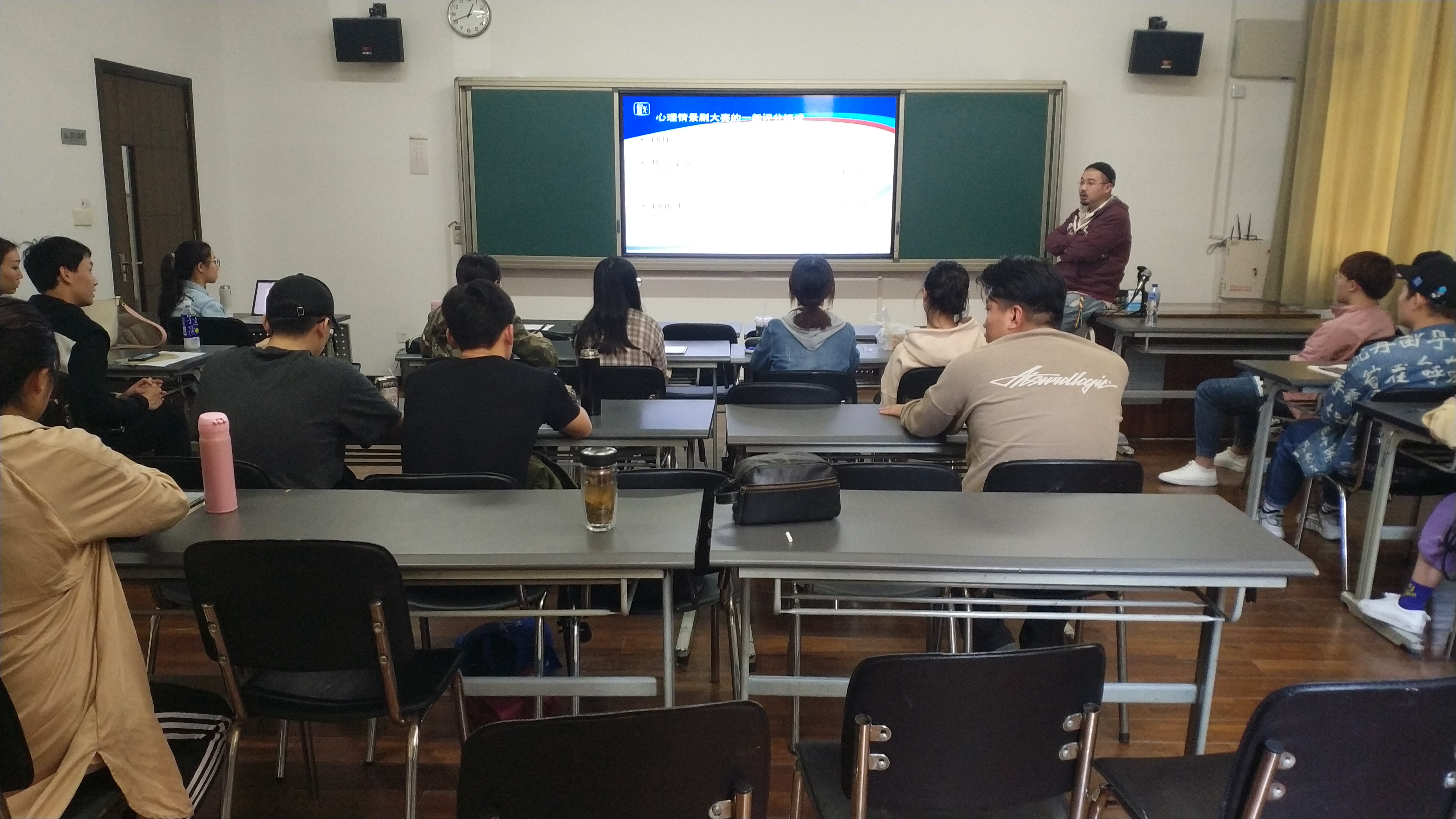接下来心理老师向大家介绍心理情景剧的内涵、功能、常用技术、主题选择和要求四个方面。夏逸石老师作为本次活动的总导演主要讲述了舞台呈现,参赛同学对此十分感兴趣,与夏老师积极互动。