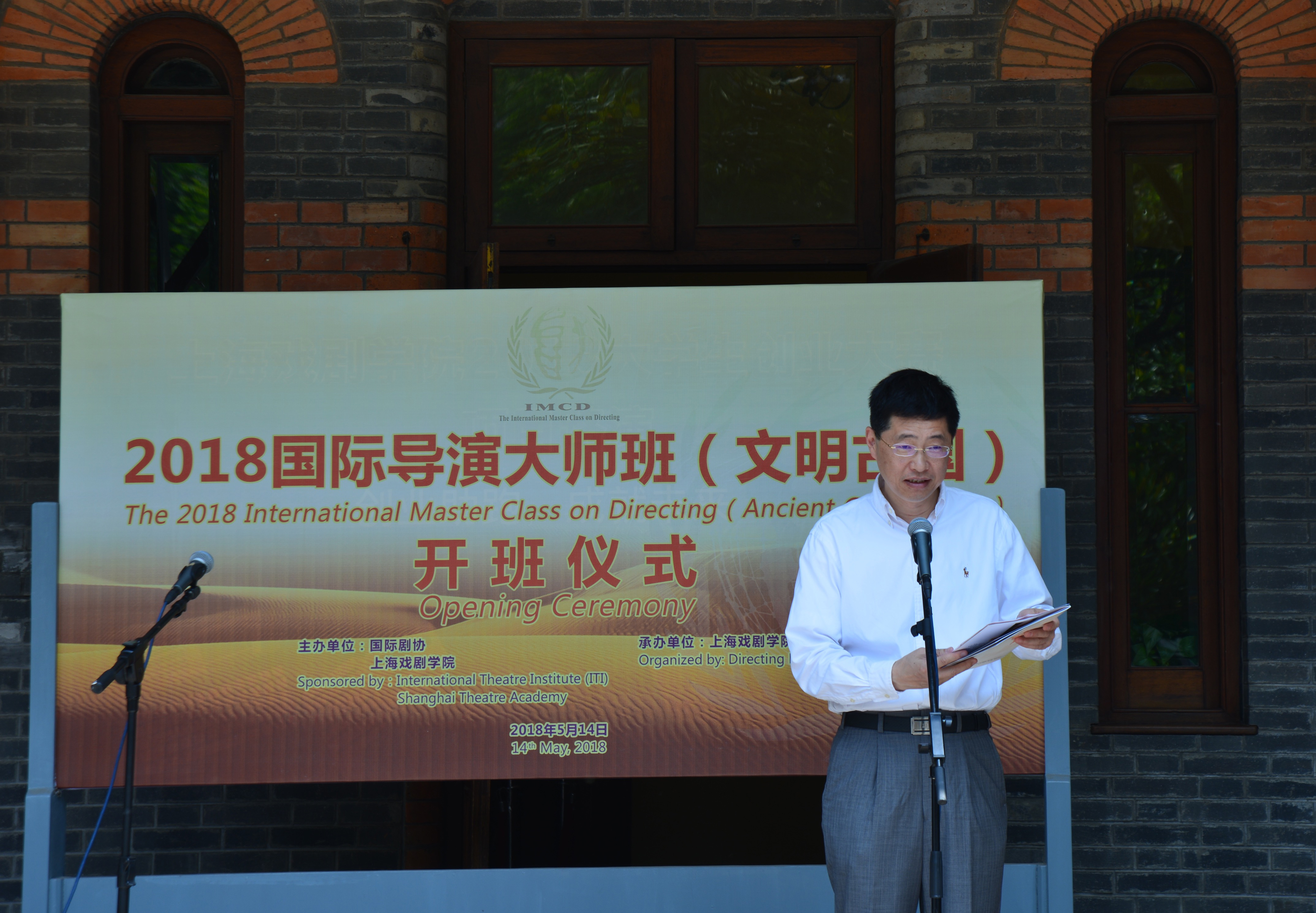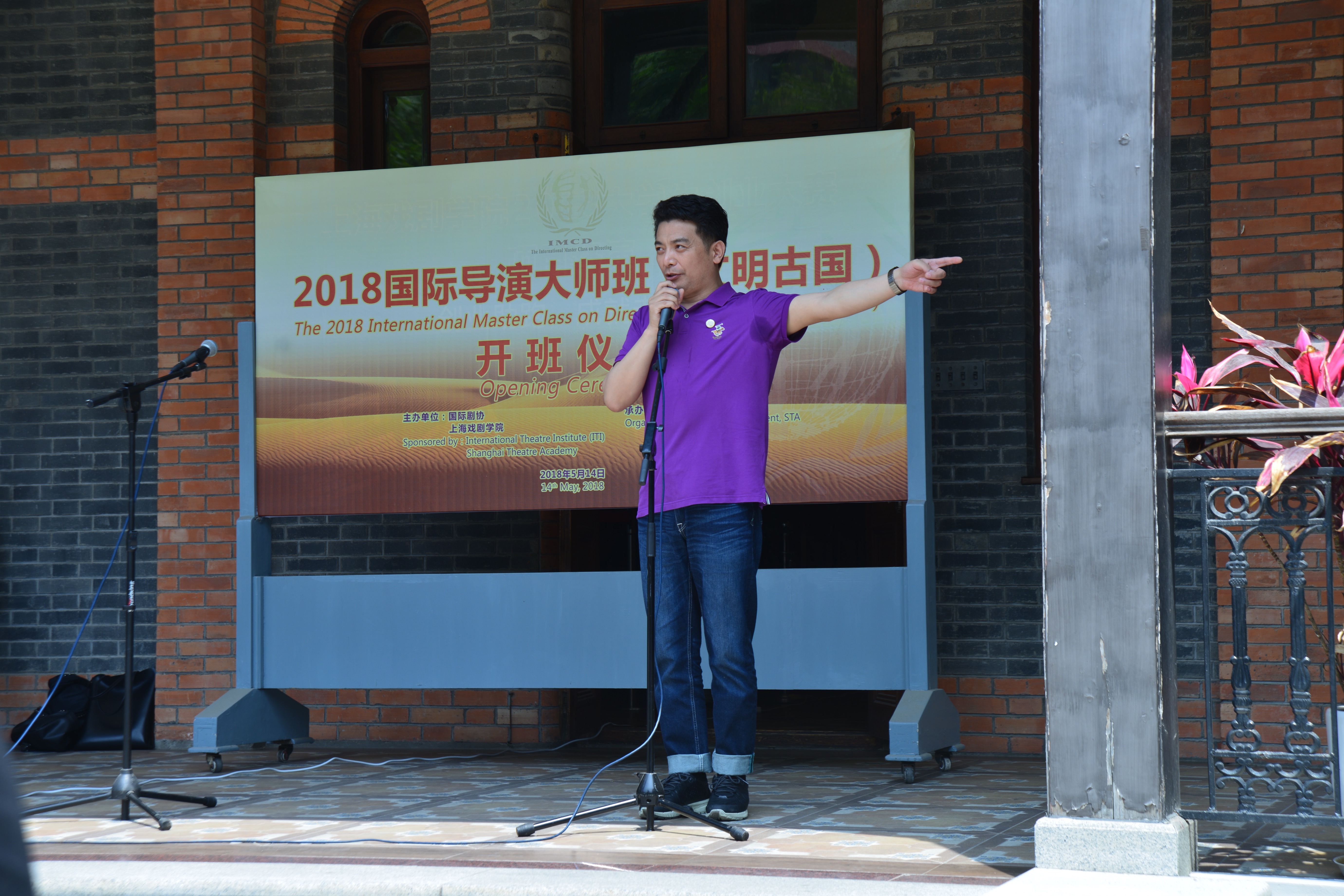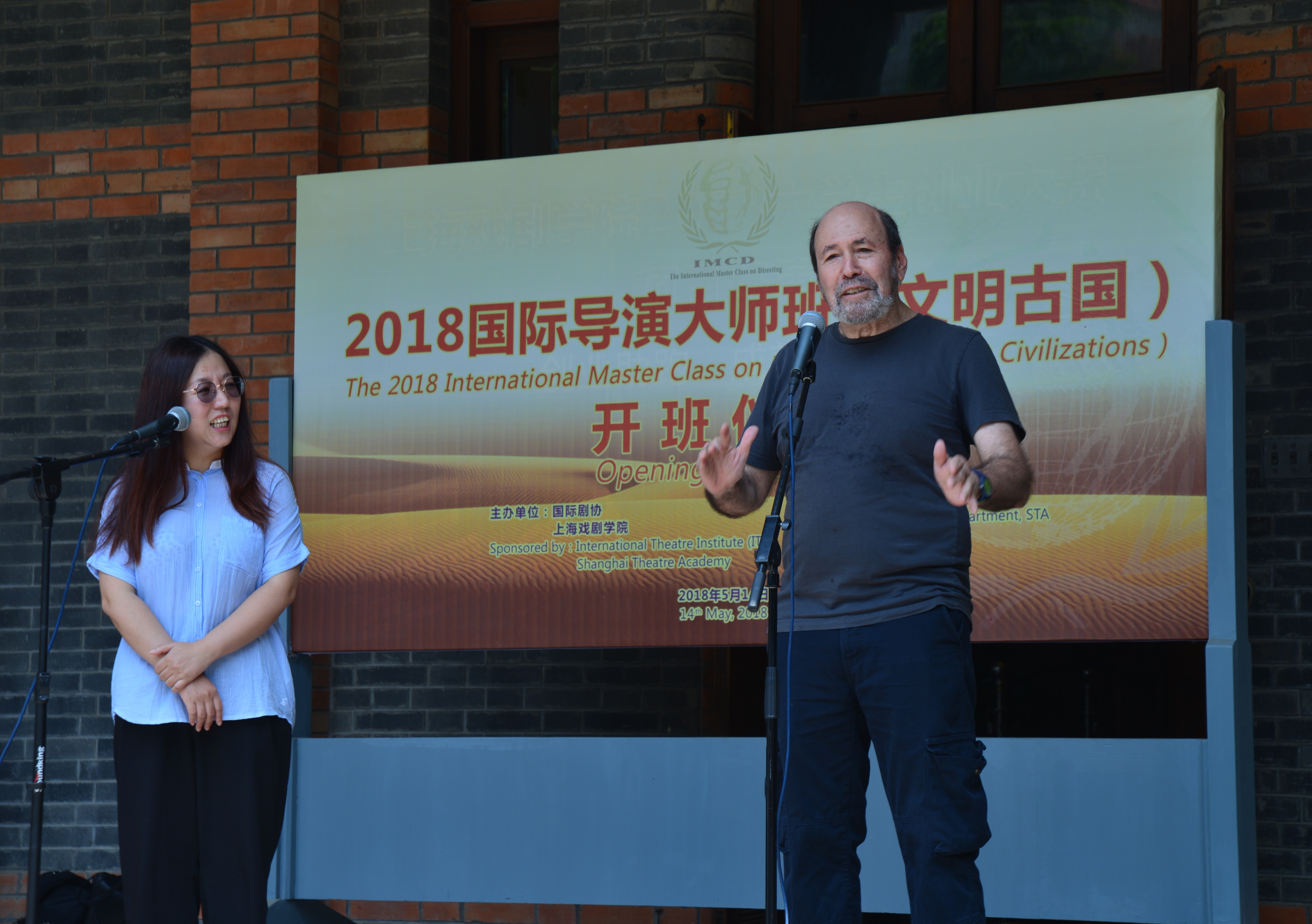 沐浴着5月明媚阳光,卢昂老师简短地介绍了此次文明古国大师班的筹备初衷和过程,以此拉开了开班仪式的帷幕。首先由大师班导师代表,以色列国家剧院总导演哈南·思尼尔先生发言。哈南的开场白幽默风趣,他说虽然他是一名导演,但是他仍然会在面对公众演讲的时候感到畏惧。不过,也正因为如此,他对舞台表演的心理特别有研究,俄罗斯的戏剧文化对以色列的影响很大,因此他的工作坊将在斯坦尼拉夫斯基理论体系的基础上,对演员如何进入角色,如何从行动到心理地体验并成为一个角色的训练过程进行训练。同时,他还会把以色列的戏剧发展情况和戏剧教育的特色介绍给中国的学员。