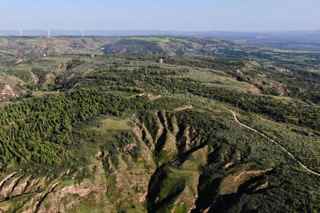 雨后的天空,干净明朗,我们登上了杀虎口长城。站在长城的至高点,向远方眺望,绵延不断的绿色山丘映入眼底,蜿蜒的古长城盘旋于山丘上,见证着70年来右玉治沙植树的历程。