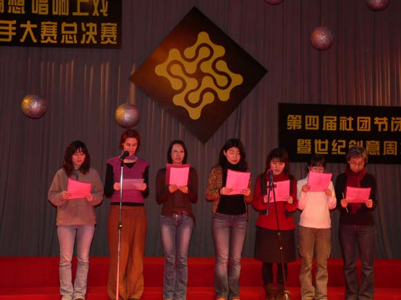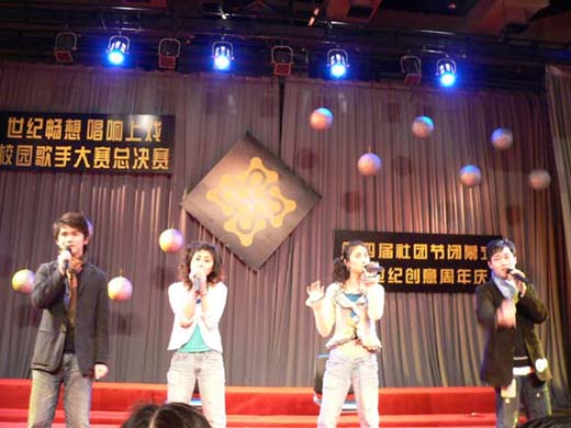 依次考察选手的综合能力。其间,高潮迭起,亮点不断,精心设计的PK环节更是使气氛达到了白热化。最终,来自表演音乐剧班03级的孔小寅凭借出色的唱功征服了评委,勇夺冠军。由表演系和电视系4位同学组成的“电表组合”以微弱的劣势屈居亚军,电04的江曙斐获得了第三名,同为电04的汪洋子以900多票的短信支持率获得了最佳人气奖。西藏班的阿旺罗布和电04的刘天一获得了鼓励奖。另外,当晚不仅有选手们的精彩演出,在场的观众也积极的参与到比赛中去,与选手们在游戏环节同舟共济。值得一提的是,来自日