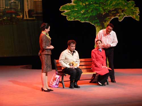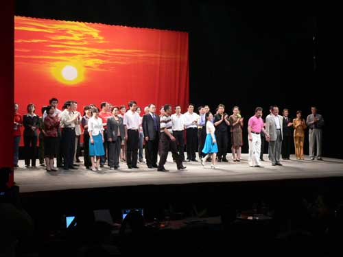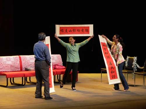 下午进行的第五场的展演是六场演出中小品数最多的,也是比较丰富的一场。在喜剧中带有一点伤感,在悲剧中透露出一丝希望,在悲喜人生中展现共产党员的光辉形象才会显得更加生动和真实。《归来》中的法官形象从我们的现实生活中就能找到典型代表,而法官那种为人质朴真诚也是让大家深深地感动;《我愿意为你》在红十字会的真情语录中,人道博爱奉献,再苦再累再委屈,看到那一张张重新获得生命希望的人们的笑脸,一切都是值得的,哪怕是母女俩之间那份难舍的真情;《科教一家人》在一个喜剧的情境中让人们看到了科教人的辛苦和无私的奉献,让人们在笑声中寻找它的合理性和真切感;而《开周有喜》则把我们拉近了2010的世博会,让我们提前进入到4年后那个繁忙而又充满活力干劲的时代……