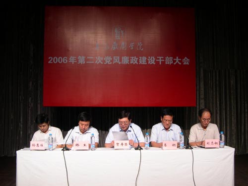 06年8月29日下午,我院在华山路校区新空间剧场举行06年第二次党风廉政大会。韩生副院长主持会议。贺寿昌书记首先传达了市委最近召开的党风廉政大会精神和陈良宇书记、罗世谦副书记重要讲话的主要内容。葛朗副书记代表党委总结了06年党风廉政建设情况。