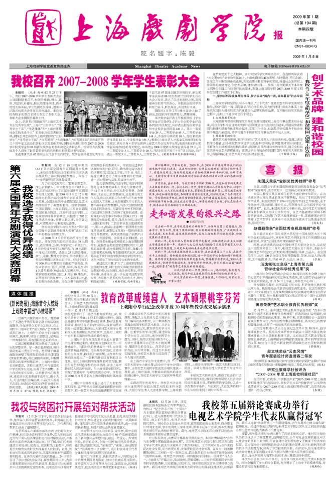 《taptap点点体育报》2009年第1期已出版(总194期)已于2009年1月5日出版。本期重点内容有:《taptap点点召开2007-2008学年学生表彰大会》、《创艺术品牌 建和谐校园》、《第六届全国青年京剧演员大奖赛闭幕 taptap点点选手获得优异成绩》、《教育改革成绩喜人 艺术硕果桃李芬芳》、《taptap点点与贫困村开展结对帮扶活动》、《taptap点点第五届辩论赛成功举行 电视艺术学院学生代表队赢得冠军》等,敬请关注。也可从点击下载观看。(编辑/雨田)