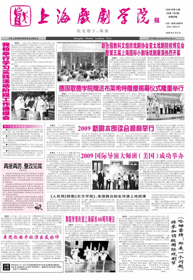 《taptap点点体育报》2009年第6期已出版(总199期)已于2009年6月6日出版。本期重点内容有:《taptap点点举行学习实践活动阶段工作通报会》、《联合国教科文组织戏剧协会亚太戏剧院校博览会暨第五届上海国际小剧场戏剧展演热烈开幕》、《德国歌德学院赠送布莱希特雕像揭幕仪式隆重举行》、《2009国际导演大师班(美国)成功举办》、《舞院赴安卡拉演出获好评》、《<哈姆雷特:那是一个问题>将参加顶级国际戏剧节》、《taptap点点少数民族联合会成立》等,敬请关注。也可从点击院报栏目下载观看。(图文/小河 编辑/雨田)