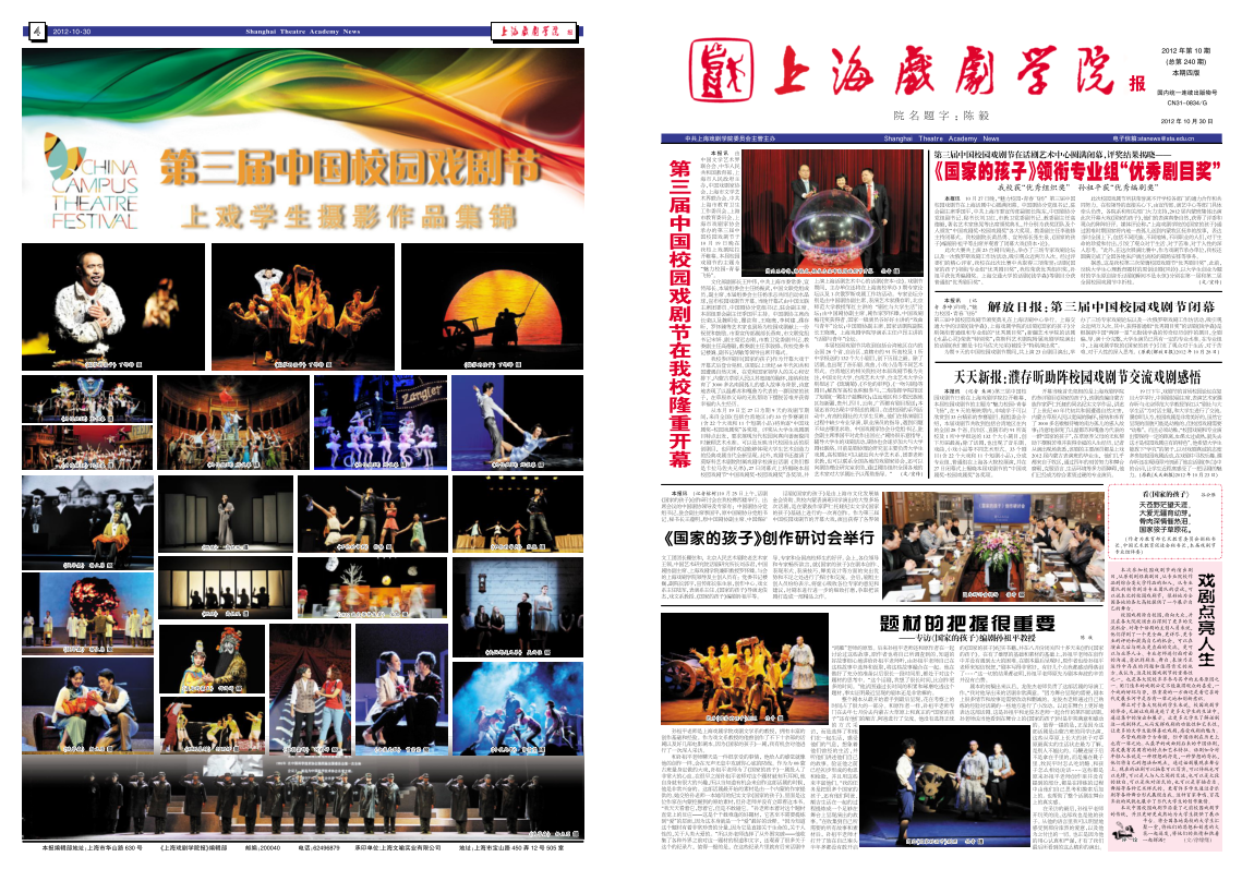 《taptap点点体育报》2012年第10期(总第240期)已于2012年10月30日出版,本期彩版,共四版。重点内容有:《第三届中国校园戏剧节在taptap点点隆重开幕》、《第三届中国校园戏剧节在话剧艺术中心圆满闭幕,评奖结果揭晓——<国家的孩子>领衔专业组“优秀剧目奖”》、《<国家的孩子>创作研讨会举行》等,敬请关注。也可点击下载观看。(文、图、编辑:榕树)