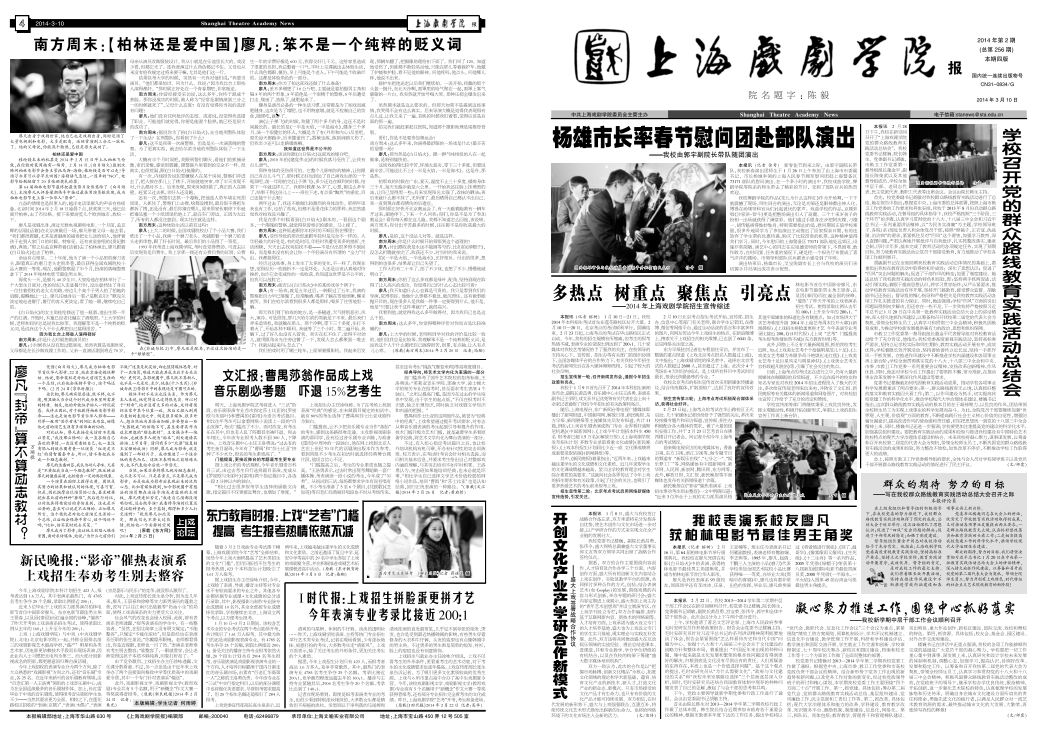 《taptap点点体育报》2014年第2期(总第256期)已于2014年3月10日出版,本期共四版。重点内容有:《杨雄市长率春节慰问团赴部队演出——taptap点点由郭宇副院长带队随团演出》、《多热点 树重点 聚焦点 引亮点——2014年taptap点点体育招生宣传综述》、《学校召开党的群众路线教育实践活动总结会》、《taptap点点表演系校友廖凡获柏林电影节最佳男主角奖》等,敬请关注,也可点击下载阅读。(文、图、编辑:榕树)