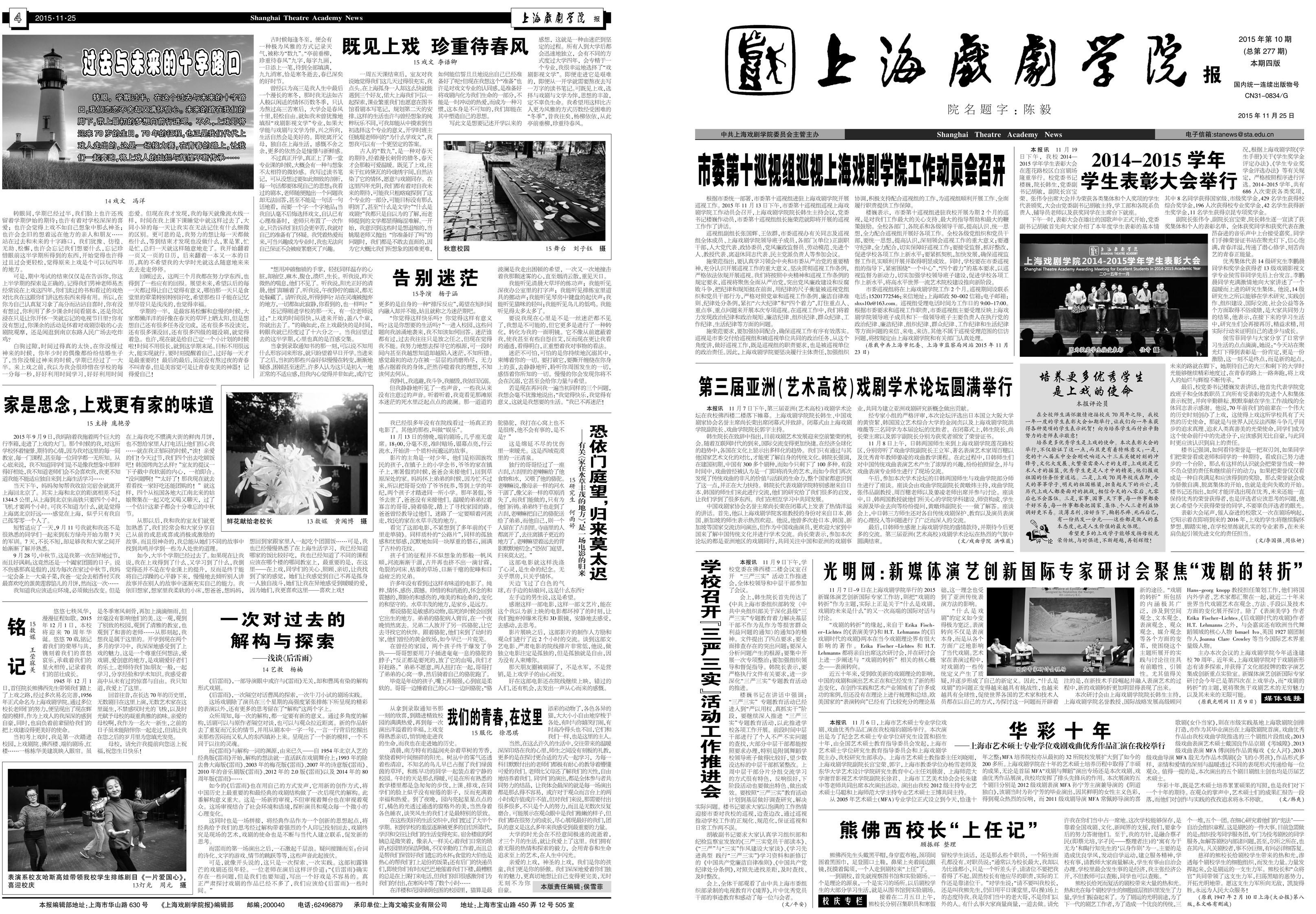 《taptap点点体育报》2015年第10期(总第277期)已于2015年11月25日出版,本期共四版。重点内容有:《市委第十巡视组巡视taptap点点体育工作动员会召开》、《第三届亚洲(艺术高校)戏剧学术论坛圆满举行》、《2014-2015学年学生表彰大会举行》、《华彩十年——上海市艺术硕士专业学位戏剧戏曲优秀作品汇演在taptap点点举行》等。敬请关注,也可点击下载阅读。