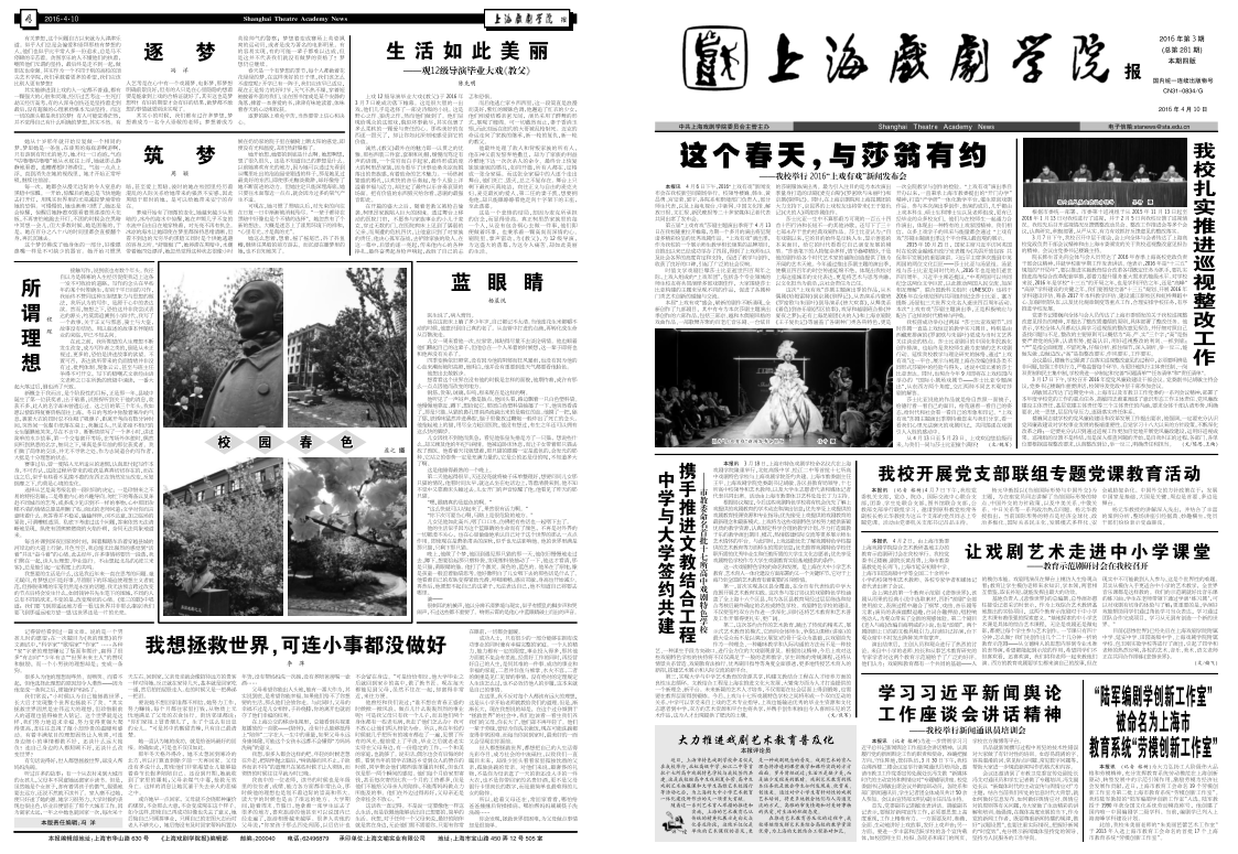 《taptap点点体育报》2016年第3期(总第281期)已于2016年4月10日出版,本期共四版。重点内容有:《这个春天,与莎翁有约——taptap点点举行2016“taptap点点有戏”新闻发布会》、《taptap点点扎实推进巡视整改工作》、《中学与大学签约共建 携手推进文教结合工程——市教委命名首批十七所高中戏剧特色学校》、《taptap点点开展党支部联组专题党课教育活动》、《让戏剧艺术走进中小学课堂——教育示范剧研讨会在taptap点点召开》等。敬请关注,也可点击下载阅读。(文、图、编辑:榕树)