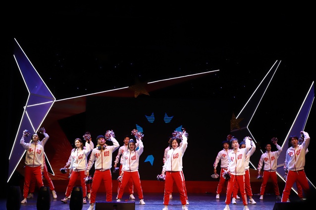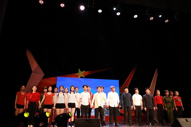 胸前大大的“中国”二字在舞台上跳动着!飞舞着!是活力的身姿!是坚定的眼神!来自导演系同学们的歌舞《青春跃起来》,点燃了整个剧场青春活力的氛围!