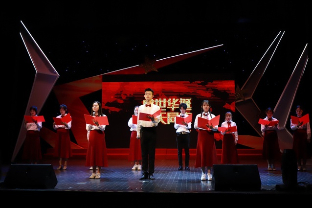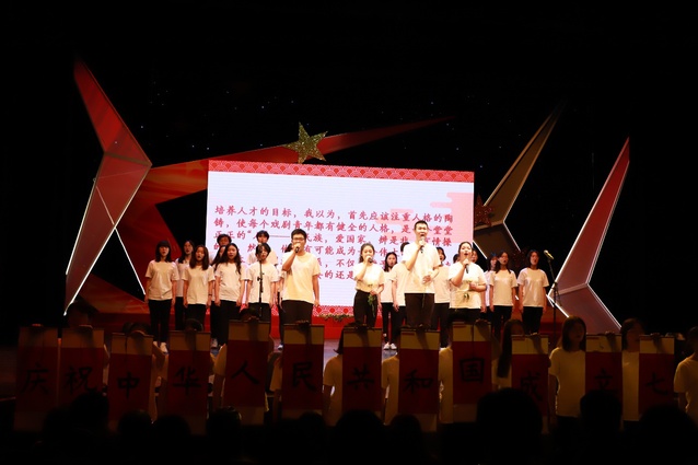伴随着慷慨激昂的朗诵,电影电视学院新生们的情景朗诵《赞歌》徐徐展开了一幅幅历史的画卷。同学们深情表达了满腔的爱国情,鼓舞了在座的戏剧青年在艺术的道路上砥砺前行。
