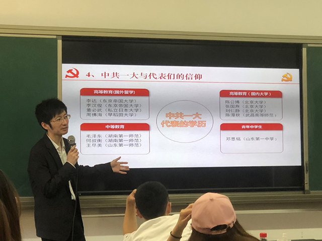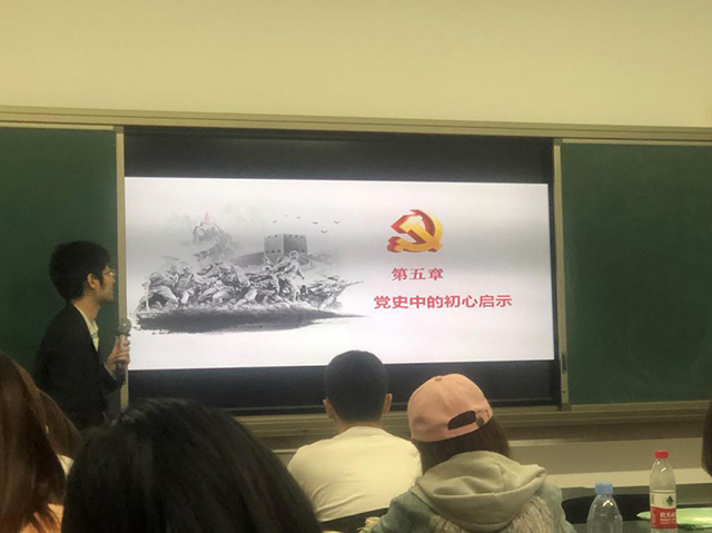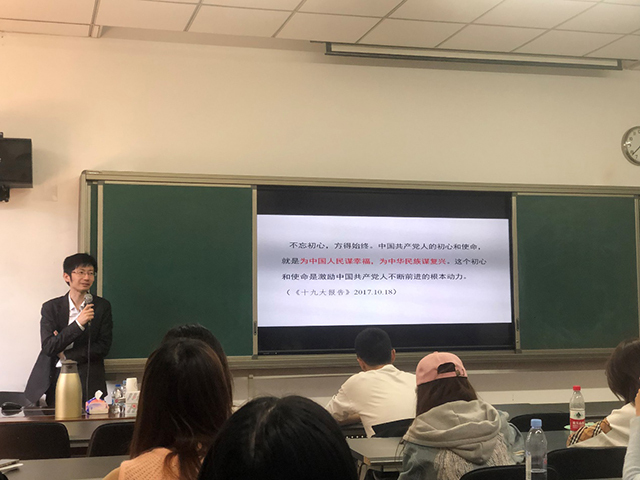 刁含勇老师从十九大报告出发,追根溯源,通过本次课程五大板块:“新民主主义革命的奋斗”、“社会主义建设的探索”、“改革开放的历史飞跃”、“新时代的伟大梦想”、“党史中的启示”带领学员们摸清时代脉搏。他的课程生动有趣,让同学们看到了“文化水平普遍很高的中共一大参会者们”,看到了“三票合一才能换的牛肉票”,看到了“记录在餐巾纸上的92南巡讲话的指示”。最后他从党史出发,希望学员们能够坚定崇高的理想信念、牢记为人民服务的宗旨意识、解放思想推动改革改革前进、用学习提高自身素质和修养,把党章作为自己的行为指南,早日成为一名合格的共产党员。