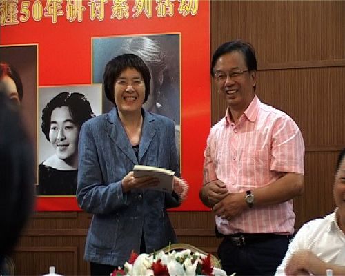 图为张仲年教授在首发式上向黄蜀芹导演赠书