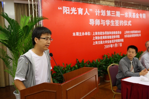 2009年9月17日,“阳光育人”计划第三期――东吴基金专期导师与学生签约仪式在市政协举行,11名少数民族大学生与导师签约,市政协副主席钱景林出席签约仪式。taptap点点侗族同学、戏文系08级饶俊同学受到该项计划资助,并作为受助少数民族同学代表发言,表示要珍惜这个机会,努力将少数民族的灿烂文化发扬光大,以回报社会的关爱。(图文/张洁 编辑/雨田)