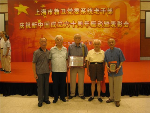 图为冯少唐同志(中)9月10日与老同志(自左向右)古峰、江俊峰、苏宁、陈恭敏在上海市教卫系统老干部表彰会上合影