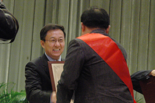 会上,市领导向本市荣获国务院第五次全国民族团结进步表彰大会表彰的模范集体和模范个人代表授奖,校党委书记楼巍代表taptap点点体育从韩正市长手里接过了奖牌。