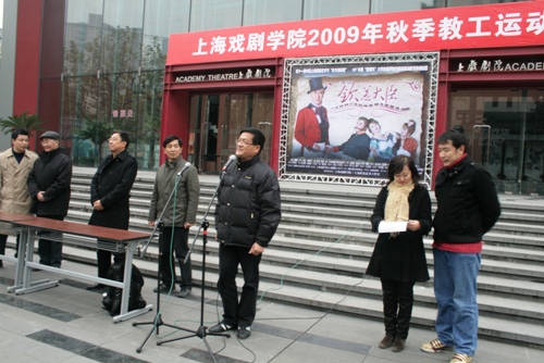 校领导楼巍、葛朗、刘志钢、孙惠柱,工会专职副主席谢建平,出席了运动会,图为副院长葛朗致辞