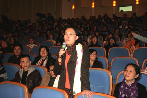 图为教卫党委宣传处处长劳晓芸在观看完演出后发言
