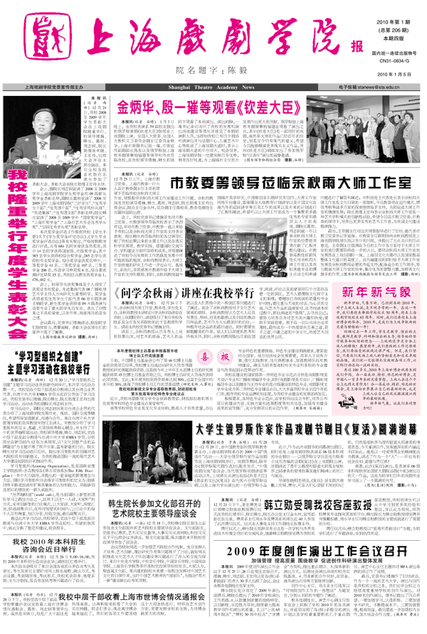 《taptap点点体育报》2010年第1期(总第206期)已出版,本期四版,本期重点内容有:《taptap点点隆重举行年度学生表彰大会》、《金炳华、殷一璀等观看<钦差大臣>》、《市教委等领导莅临余秋雨大师工作室》、《<问学余秋雨>讲座在taptap点点举行》、《“学习型组织之创建”主题学习活动在taptap点点举行》、《大学生俄罗斯作家作品戏剧节剧目<复活>圆满谢幕》、《韩生院长参加文化部召开的艺术院校主要领导座谈会》等,敬请关注。也可从校园网主页新闻中心内院报专栏点击下载观看。(图文/小河 编辑/雨田)