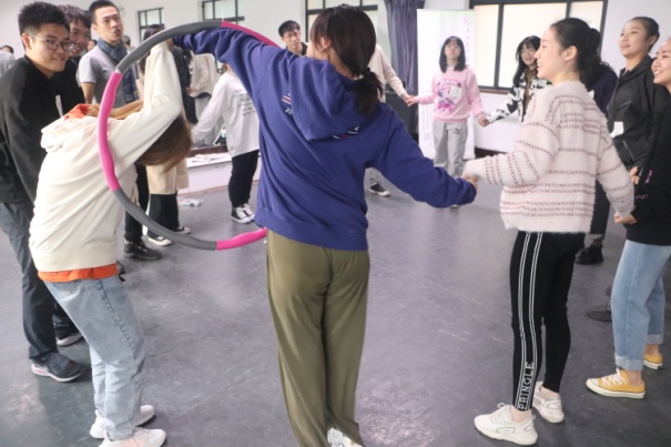 通过拉手传递的方式,让呼啦圈穿越每位成员,有些同学尽管姿态有些小狼狈,可依然忘我地进行着。甚至有一组的呼啦圈意外断开,他们也不放弃,在败局已定的情况下,一丝不苟的完成了比赛。