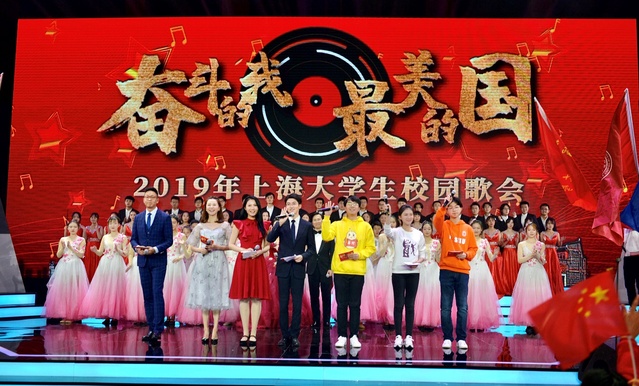 2019年12月15日晚,“奋斗的我 最美的国”2019年上海大学生校园歌会在上海财经大学体育馆举行。副市长陈群、市政府副秘书长虞丽娟,市教卫工作党委、市教委负责同志,本市有关高校负责同志出席。taptap点点表演系(含音乐剧中心)余笛老师倾情献唱,16级音乐剧专业刘珂君同学担任《我和我的祖国》领唱,18级主持专业黄舒宁同学担任现场拉歌环节主持人。