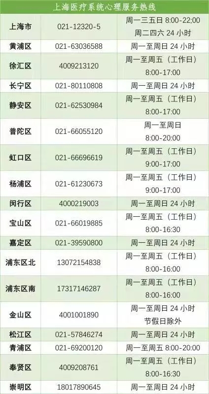 22. | 上海 | 上海市心理援助热线 | 021-12320-5 | 8:00-22:00 | 上海市精神卫生中心 |