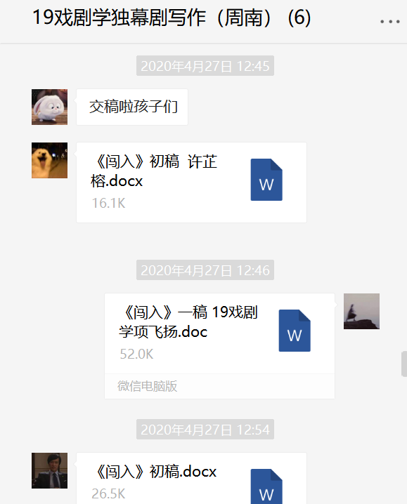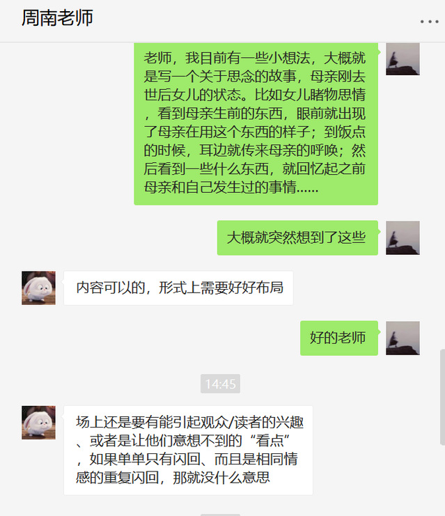 本学期在周南老师的带领下,我们小组主要通过微信的聊天功能以及语音会议功能进行了小组课的学习。周南老师会根据我们小组三位同学的学习情况及剧本创作情况进行不同的调整。通常,在进入正式写作之前,周南老师会通过微信语音会议带领我们先进行对于剧本或影视作品的分析,通过对作品中人物行动线的梳理,我们学习到了如何巧妙地设置戏剧情境、戏剧的动作与反动作等,以及明白了人物性格对于戏剧情节发展的重要性。在进行了作品的分析之后,我们便正式开启了独幕剧写作的任务。通常一个独幕剧作业的完成分为四个阶段:构思、初稿、二稿和定稿,这些写作的过程都是在课下进行的。完成每一个阶段的写作后,老师会通过微信语音会议来对我们每个人的作业进行细致的点评,我们可以随时提出自己的疑问和想法,然后根据老师提出的修改建议进行下一个阶段的写作。周南老师注重因材施教,在除却上课时间的平时,老师也欢迎我们随时与她交流有关戏剧的问题,对于我们的问题周南老师都会温柔细致的回复,并耐心地引导我们朝更好的方向进行思考。在周南老师负责严谨的教学态度,温柔耐心的教学风格下,我们的写作水平有了显著的提高,对于戏剧相关概念的理解也更加清晰。