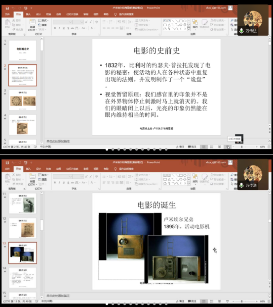 自本学期第九周开始,17级戏文班同学们迎来一门新课——万传法老师主讲的《电影观念史》。万老师主要通过腾讯会议与超星学习通进行讲课,以电影视频作为辅助,进行举例讲解。万老师就电影的史前史讲起,依据时间顺序,自“诡盘”的发明制作,与视觉暂留原理的发现开始,讲至电影的诞生,及其主要构造特点与优点,并列举为何将这一天作为电影诞生日的原因,图文并茂,条理清晰,帮助同学们更好地捋清电影发展的脉络。电影本性的最初探索部分,主要分为卢米埃尔和活动照相性、梅里爱和戏剧化电影两节。万老师安排同学们观摩卢米埃尔兄弟的《工厂大门》、《火车到站》等影片,以及乔治·梅里爱的《蓝胡子》、《月球旅行记》等多部短片,以便对早期电影技术有更为深刻确切的了解。同时,万老师就所讲内容提出问题,即卢米埃尔兄弟所开创的纪实路线以及对后世的影响,与梅里爱所开创的戏剧电影路线以及其对后世的影响,激发了同学们的思考与讨论,并对老师所讲内容有更加专业的理解。