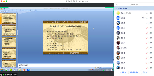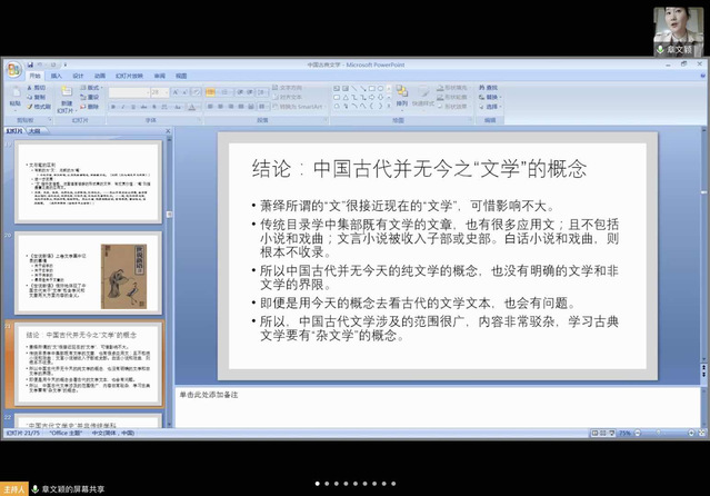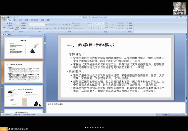 自第九周开始,章文颖老师的《中国古典文学》开课了。这门课采取腾讯会议线上直播的方式授课。上课时老师将会共享精心制作的PPT,列出详细的知识点,便于同学们笔记以及对知识形成系统化的理解。章老师特别注重与学生之间的互动,鼓励同学们将理性与感性相结合来形成对于古典文学的独特感受与思考。同时,老师还会补充课外的阅读书目和资料,