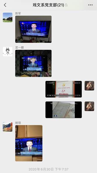 2020年6月30日晚上7点,在学院党委的号召下,戏文系全体党员准时守在电视前,收看中央电视台的《新闻联播》节目,认真学习习近平总书记给复旦大学《共产党宣言》展示馆党员志愿服务队全体队员的回信精神。收看之后,党员老师们立刻积极认真地发表自己的学习心得。